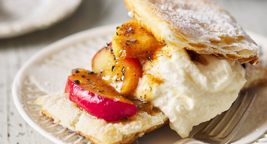 Lägg ut fyra smördegsflarn och fördela ut några matskedar vaniljgrädde. Toppa med äpplen och smördegsflarn.