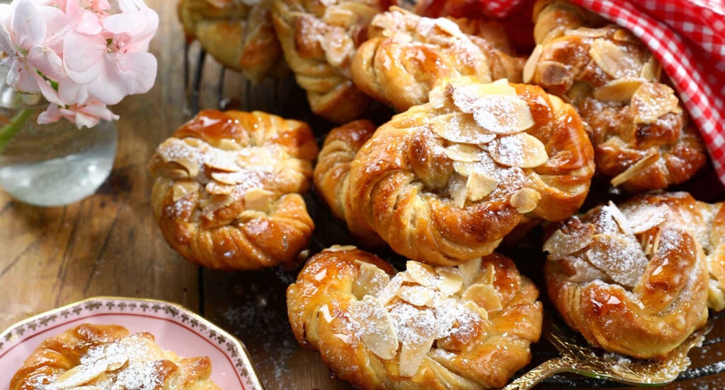 Lägg kringlorna på plåtar med bakplåtspapper, pensla med uppvispat ägg och toppa med mandelspån. Låt jäsa utan bakduk ca 30 minuter.