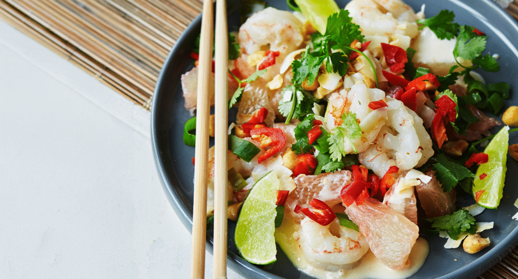 - Hacka jordnötter och kokoschips grovt. Blanda de avsvalnade räkorna i kokossåsen. Vänd sedan ihop räkblandningen med jordnötter och kokoschips. Lägg i pomelofiléerna och blanda försiktigt. Fördela på ett serveringsfat. Garnera med färsk koriander och limeklyftor.