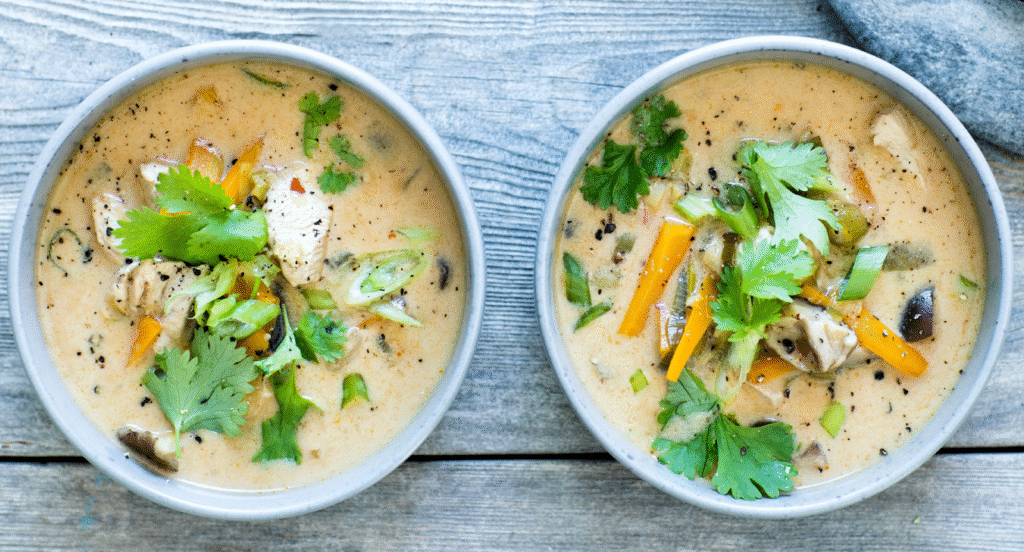 - Rör ner kokosmjölken och tillsätt sedan svampen. Låt soppan koka upp och sjuda ett par minuter. Smaka av med fisksås, limesaft och peppar. Dekorera med koriander eller persilja före servering.