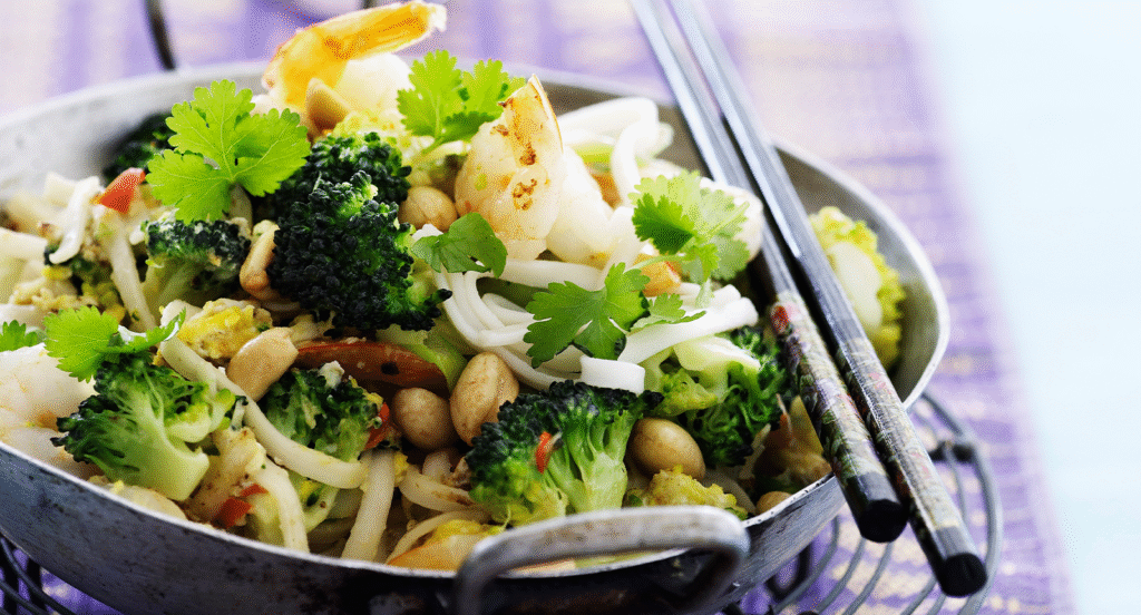 - Lägg i nudlar, räkor, fisksås, limesaft, socker, chili och hälften av jordnötterna. Stek och blanda allt i 3–4 minuter.