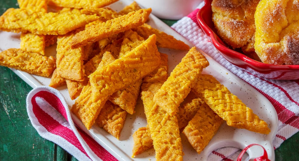 - Grädda mitt i ugnen i ca 9 minuter. Skär de varma längderna i sneda snitt.