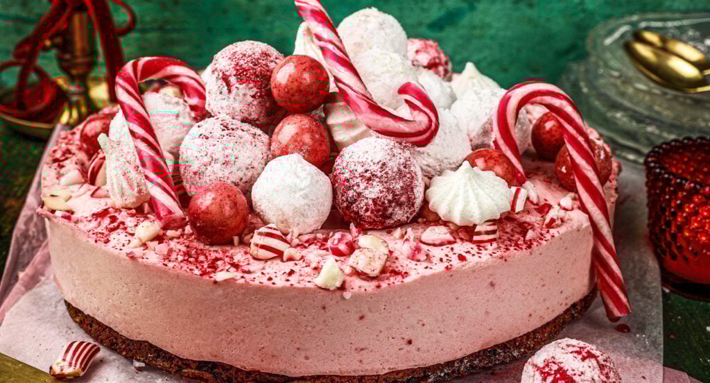 - Garnering: Ta upp tårtan på ett serveringsfat, ta bort konditoriremsan. Garnera tårtan med de krossade polkagrisarna. Toppa med polkagriskäppar och julgodis och sikta över hallonpulver. Lägg på maränger och servera.