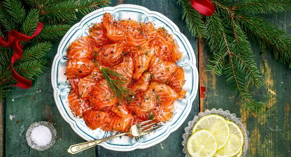 - Lägg fatet med laxen i en rymlig plastpåse. Förslut påsen och ställ fatet i kylskåp. Fisken är färdigrimmad efter 2–3 dygn, beroende på tjocklek.