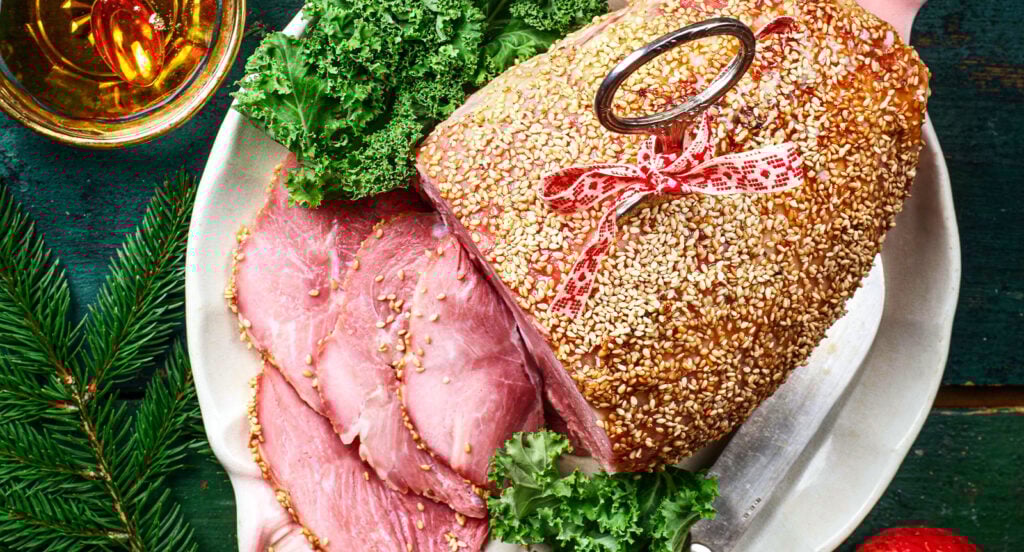 - Rör ihop honung, sirap, senap, ingefära och vinäger och fördela blandningen över skinkan. Garnera med sesamfrön. Sätt in skinkan i nedre delen av ugnen 10–15 minuter. Passa noga så att den inte blir bränd.