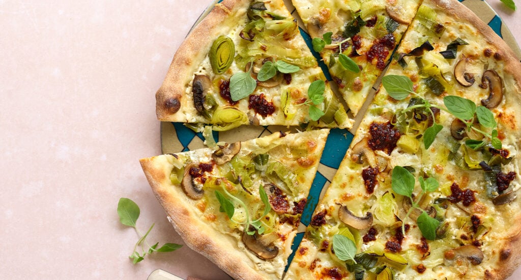 - Toppa med purjolök, champinjoner, klickar av ‘nduja och mozzarella riven i mindre bitar. Krydda med salt och peppar.