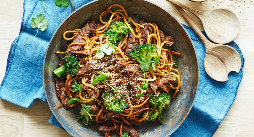 - Hetta upp 1 msk olja i en stor wokpanna eller annan djup panna. Stek lök och broccoli hastigt i 2 minuter. Lägg över på en tallrik. Tillsätt 1 msk olja i den heta pannan och stek det marinerade nötköttet hastigt i 1–2 minuter. Tillsätt nudlar, stekta grönsaker, buljong, socker och ½ dl hoisinsås. Vänd allt försiktigt i pannan. Värm kort och smaka av med salt, peppar och färskpressad limesaft.