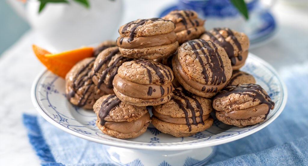 - Spritsa eller bred ut krämen på den platta sidan på hälften av kakorna. Lägg på de andra kakorna med den platta sidan mot smörkrämen.