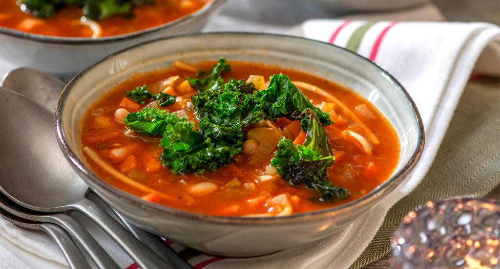 - Fräs grönkålen på hög värme i olja. Toppa soppan med kålen.