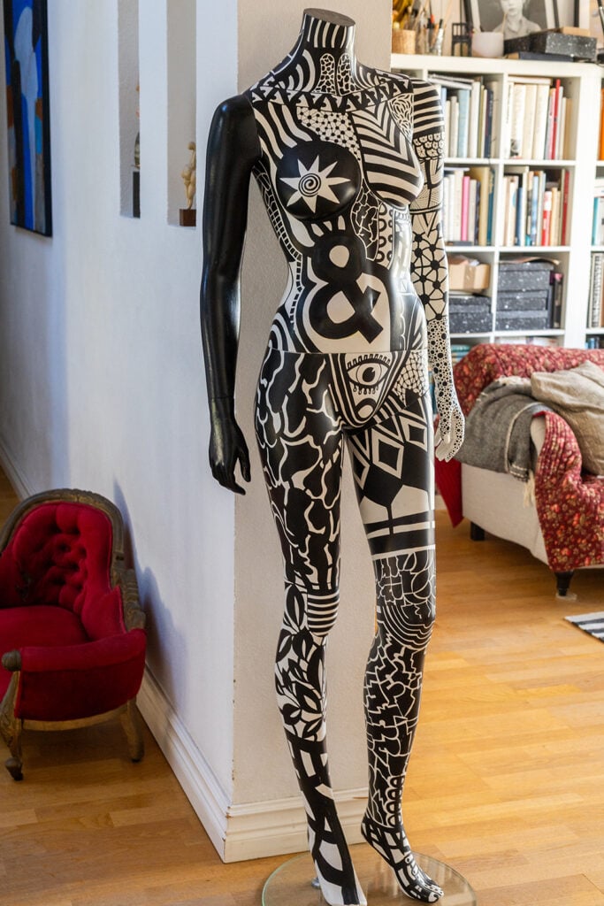 – Jag fick för mig att vi skulle måla på skyltdockor. Och när vi hade gjort en så fick vi mersmak och ville göra fler. Så vi sitter här och målar tillsammans och lyssnar på poddar, säger Fanny.