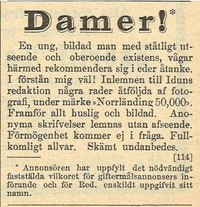 Året är 1890 och en 27-årig man skriver under rubriken ”Damer!” i Dagens Nyheters småannonser att han ”på detta moderna sätt” söker en maka.