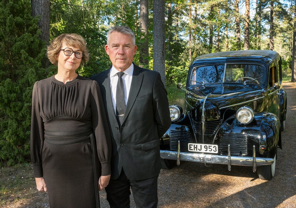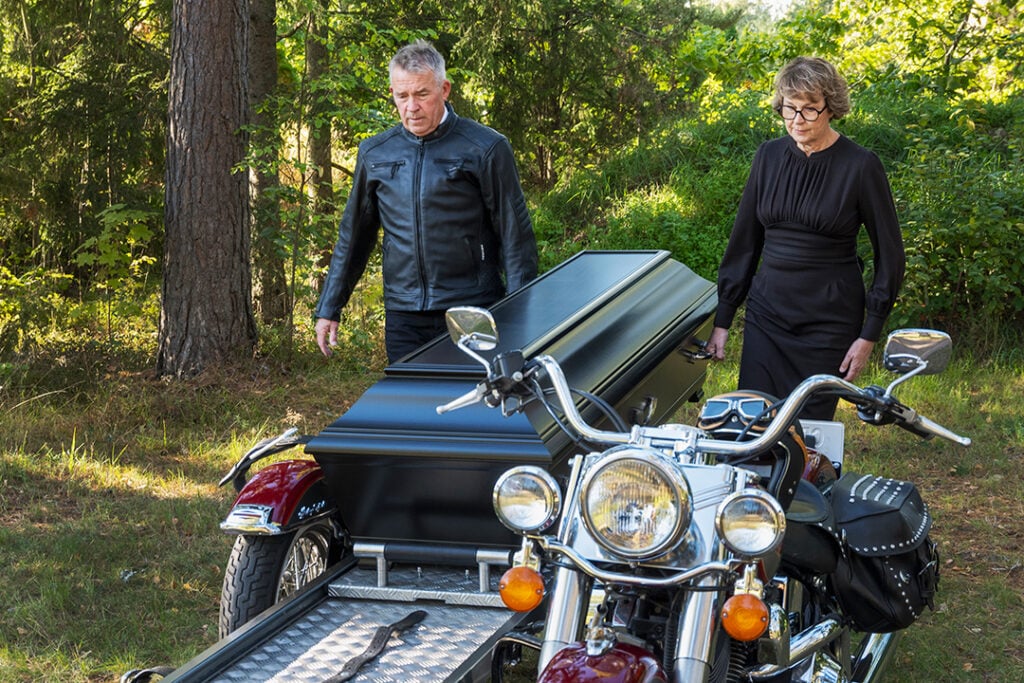 Sedan 13 år har Git Åkeson drivit en begravningsbyrå med en stark vilja att alla ska få en så personlig ceremoni som möjligt. Hennes man Lennart är finsnickare och hjälper till med verksamheten. Och det är han som byggt om motorcykeln – en Harley-Davidson Heritage Softtail från 1997 – så att den kan uppfylla ett viktigt ändamål: att bjuda på den allra sista färden. Sittbrunnen i sidovagnen har han låtit ersättas av en släde där en kista kan placeras. Kistan hålls på plats med rejäla spännband.