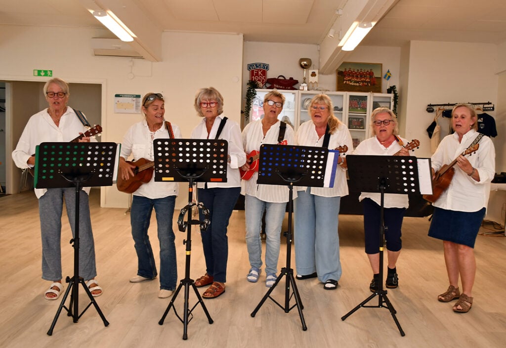 Det svänger rejält när medlemmarna i ukuleleorkestern slår an ackorden och sjunger i stämmor för full hals. Musiken hörs långt utanför föreningslokalen på Väsby idrottsplats utanför Höganäs, där de repeterar.
