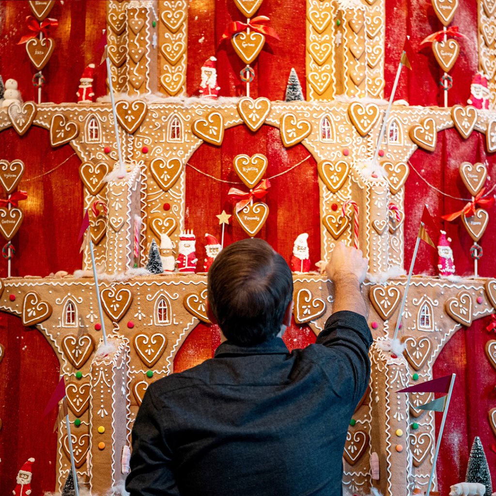 Även till förra årets pepparkakshus var flera personer inblandade. Där frågade han människor om vad de förknippar med ordet snällhet, för man blir ju ”snäll av pepparkakor” enligt talesättet. Svaren skrev han sedan på pepparkakshjärtan som fästes vid tornet. På frågan om varför han ofta använder den här metoden kommer svaret snabbt.