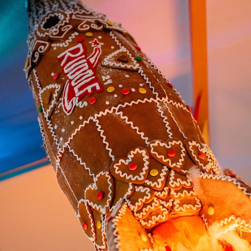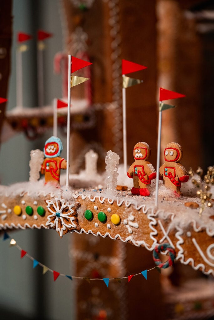 Att skapa så stora konstruktioner av pepparkaka innebär att bygget inte riktigt går till som när man gör ett vanligt pepparkakshus. Bland annat limmar Erik Olof ihop delarna mot en stomme och fixerar bomullen med hårsprej. Dessutom krävs en annan slags utrustning.