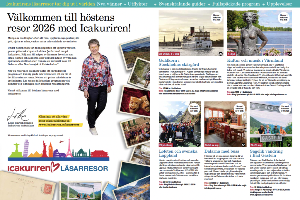 Under “Aktuella läsarresor” publicerar vi alla årets läsarresor i takt med att de kommer ut i tidningen. I vår- och höstprogrammet nedan kan du se i vilket nummer av tidningen som respektive resa presenteras. Är du här för att finna inspiration så hittar du vårt arkiv på tidigare resor längre ner på sidan.