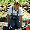 Grävandet tar på armmusklerna, och på knäna har vi knäskydd. Marken är stenhård, så det känns att ligga på knä hela dagarna. Tidvis arbetar vi i total tystnad och då hörs bara hackornas rytmiska slag mot jordlagren. Regnet försvinner till lunchen, som vi äter utomhus vid vår grop, och jag kan villigt erkänna att vi alla är oerhört hungriga efter allt arbete. Formidabel aptit Några turister kommer förbi och tittar intresserat på vårt slitjobb med jorden, och vi får också besök av den bofasta bonden Gösta Karlsson vars släkt bott på ön och brukat jorden här i flera generationer. Solen skiner nu, och Siv gräver fram en flintsten…