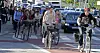 –  Precis i rusningstid kan det vara väldigt många särskilt i städer som Malmö och Lund. Men annars är cyklisterna inte så många faktiskt. Och i Köpenhamn går cykeltrafiken väldigt snabbt. Där har de en snitthastighet på 17 kilometer i timmen. Där ska man inte ge sig ut och cykla om man inte kan reglerna. Du får till exempel aldrig stanna på cykelbanan, i så fall måste du ta dig upp på en trottoar och du ska göra stopptecken om du ska stanna. Det finns särskilda kurser för den som tänker börja cykla i Köpenhamn.