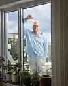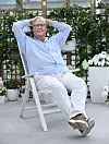 Vi ses i hans stora ljusa lägenhet i Mörby centrum utanför Stockholm. 17-årige sonen håller sig på sitt rum, hustrun är i huset på Lidingö, men det är här i soffan eller på balkongen som Jonas Jonasson hamrar fram sina romaner. Fötterna på bordet, en kudde under datorn och så är han igång. Den fantastiska mattan under bordet är ett fynd från hans fru Aryans iranska släkt, men de vackra Mårbacka-pelargonerna och örtodlingarna i köksfönstret är Jonas egna hemmapyssel.