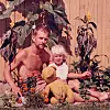 1965. ”Trädgårdsarbete med pappa Sten och ständige följeslagaren nallen.”
