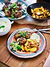Grekisk mat är en favorit hemma hos familjen Hoffsten-Bratt. Här serveras rustika färsbiffar, gärna med krämig tzat­ziki, grekiskinspirerad klyftpotatis och sallad. Foto: Stefan Wettainen