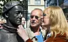 Marie-Louises skulptur ”Det Svenska Svårmodet” med rinnande tårar avtäcks i Altonaparken i centrala Malmö 2004. Konstnären och modellen Gösta är på plats. Foto: TT