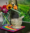 Rickard Södersbergs favorit i köket är en stenmortel. ”Den är stor, tung och rejäl, inget mesigt litet bjäfs i mässing. Jag kör allt i den. Mycket kryddor och örter från vår koloniträdgård, bland annat. Min man Anders har fått morteln av sin farmor.” Foto: Gugge Zelander