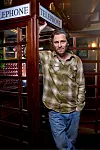 In genom dörren på Scalateatern i Stockholm kommer en trebarnspappa i rutig skjorta, lite trött efter en hel dags repetitioner i en kvav teaterlokal. Han skulle säkert kunna ställa sig vid teaterns bardisk och ta en öl, utan att väcka någon större uppmärksamhet.