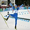 En jublande Björn Ferry över mållinjen efter guldloppet i jaktstart under OS i Vancouver 2010.