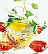 Blanda yoghurten med ost och pepparsorter. Stek ägget, rosta eller stek de kantskurna brödskivorna. Lägg ihop mackan med ansjovis, ostkräm och ägg. Rosta snittytan på de halverade tomaterna i stekpannan och placera dem runt rätten.