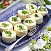 Skär vid serveringen upp rullen till äggpuckar, ca 2 cm tjocka. Garnera med gräslök och blommor.