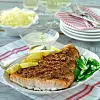 Senapssås: Blanda crème fraiche, senap, citronskal och -saft, limeskal och -saft och honung. Smaka av med salt och peppar. Servera med pressad potatis.