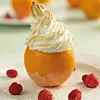Frys in krämig parfait i apelsinens eget skal. Toppa sedan med spritsad maräng och låt den få färg någon minut i ugnen. Raffinerat, festligt och utsökt gott!