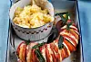 Sätt ugnen på 200 grader. Dra skinnet av korven. Skär den i skivor, nästan hela vägen ner, men inte helt igenom. Lägg korven i en smord ugnssäker form.