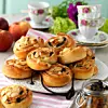 Ta upp degen på mjölat bakbord och dela i två bitar. Kavla ut varje bit till en platta, 40x30 cm. Bred på smörfyllningen och strö över rivet äpple och russin. Rulla ihop och skär i bitar.