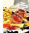 Blanda färsen hastigt med salt, peppar och vatten till en aningen lös smet. Forma åtta färsbiffar och linda bacon runt dem. Lägg biffarna ovanpå grönsakerna i ugnen och låt allt bli genombakat, ytterligare cirka 25 minuter. Biffarna är färdiga när de inte längre känns elastiska vid pekfingertryck rakt uppifrån.