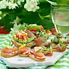 Fyllning 2: Hacka tomaterna. Skär osten i bitar. Blanda to-mat, ost, olja och basilika. Krydda med peppar. Lägg bredvid skinkan.