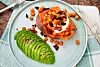 Medan sötpotatisen bakas i mikron fixas toppingen med knaperstekt chorizo och kikärter. En klick sval crème fraiche och krämig avokado och du har en komplett middag.