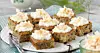 Kokosfrosting: Vispa ihop kokosolja, rumsvarmt smör, florsocker, vaniljsocker och kokosmjölk till en smet. Skär kakan i rutor. Bred, klicka eller spritsa på frosting och strö på kokoschips.