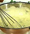 Tillsätt nu smöret, först droppvis sedan lite mer i taget under ständig vispning, lämna bottensatsen. Blir såsen för tjock, späd med lite vatten. Blanda avslutningsvis i dragon, persilja, salt och peppar.