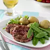 Forma 4 biffar och stek i smör ca 4 minuter per sida. Servera med kokt potatis och sockerärtor.
