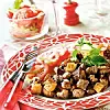 Halvera, skala och tärna lökarna, låt dem svettas med smörklick i medelvarm stekpanna tills de är mjuka och genomskinliga. Rör om emellanåt. Ta upp, håll varmt.