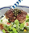 Forma fyra biffar. Stek dem cirka 2 minuter på varje sida i drygt medelvarm stekpanna tills de är precis genomstekta. Toppa med kapris.