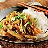 Bryn köttet i het stekpanna med olja och lägg över i en panna eller gryta. Fräs lök och vitlök i oljan i en såskastrull. Tillsätt vatten, fond, soja, sweet chili, muscovadosocker och eventuellt sambal oelek. Koka ihop såsen i tre minuter, red av med majsena till simmig konsi–stens. Häll såsen över köttet och blanda i väl avrunna bambuskott. Koka upp och servera med nykokt jasminris.