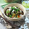 Tillsätt köttet och koka under lock, ca 5 minuter. Blanda i ärterna och koka ytterligare några minuter. Smaka av med salt. Strö över koriander och eventuellt kokoschips. Servera med jasminris.