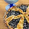 Skala och skiva bananen tunt och fördela skivorna i pajskalet. Strö potatismjölet över. Varva blåbär med 2 matskedar strösocker. Kavla resterande deg, pricka och sporra ut snibbar att lägga som solstrålar över bären. Nyp samman bottenkanten och solstrålekanten, pensla med uppvispad äggvita och grädda cirka 30 minuter på galler längst ner i ugnen. Låt svalna lite före servering.