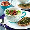 Skiva korven och stek den i en stekpanna med smör. Bred smör på brödskivorna och strö på dill. Gratinera i 5 minuter. Servera till soppan tillsammans med korven.