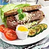 Lägg salladsblad på två av brödskivorna och lägg på biffarna. Toppa med pepparrot och en skiva bröd. Servera med äggula, skivad tomat och grillad skivad squash.