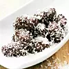 Dela stängerna i 20 bitar, smält chokladen försiktigt i vattenbad eller mikro och doppa stängerna i den. Lägg på bakplåtspapper och strö över kokosflingor.