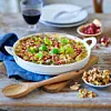 Häll över blandningen i en smord paj eller gratängform med inte allt för höga kanter. Strö över nötter och riven ost.